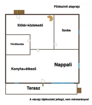 A bejáratnál a napfényben üldögélve lehet élvezni a terasz adta nyugalmat. A házba lépve a földszinten egy korszerűen felszerelt konyha+étkező, nappali, előszoba, szoba és zuhanyzós fürdőszoba található. A fürdőszoba éke a beépített  finn szauna, mely eladáskor marad az új tulajdonosnak.