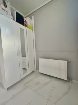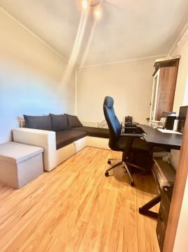 A szobák szintén laminált parketta burkolatot kaptak, míg a fürdőszoba kerámialapos borítást.