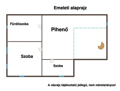 Az emeletre stabil fémvázas lépcső vezet, ahol egy pihenő került kialakításra innen nyílik 2 szoba,  kádas fürdőszoba.