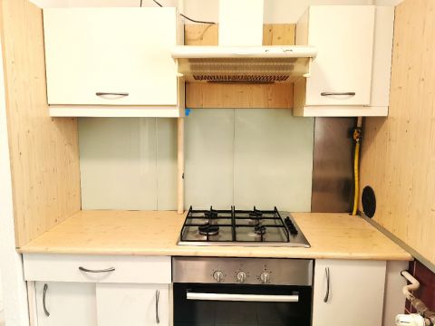 A konyha világos, (ablakos) szép panorámával, benne gáztűzhely, elszívóval, továbbá van egy nyitott bepolcozott kamra rész.