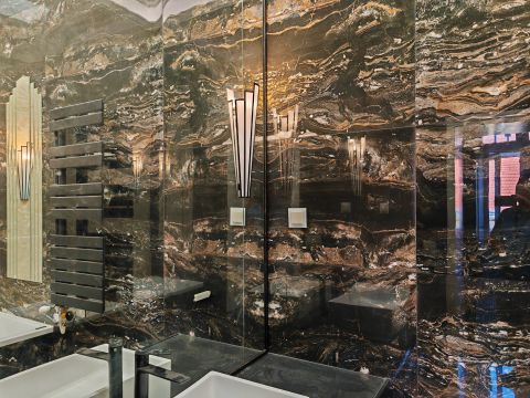 Az egyedi megrendelésre készült világítótestek és bútorzatok harmonikusan egészítik ki a műemléki épület beltereinek luxust tükröző stílusát.
