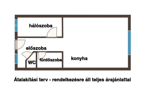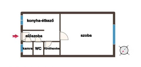 előszoba, tágas, 20 m²-es szoba, konyha-étkező, kamra, valamint külön fürdőszoba és WC kézmosóval. Az ingatlan közepes állapotú, így igény szerint könnyen saját ízlésre formálható.