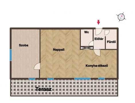 Az elrendezés praktikus és jól élhető: nappali + 1 hálószoba, fürdőszoba és külön WC.