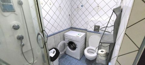 A tágas fürdőben egyik oldalon zuhany és a WC, másik oldalán sarokkád és a csap is helyet kapott.
