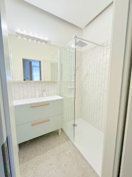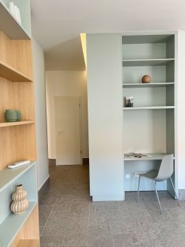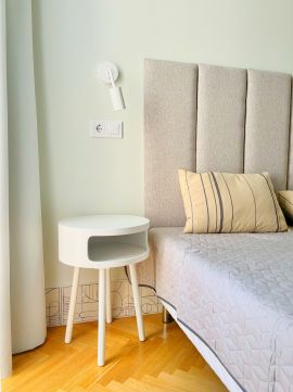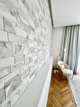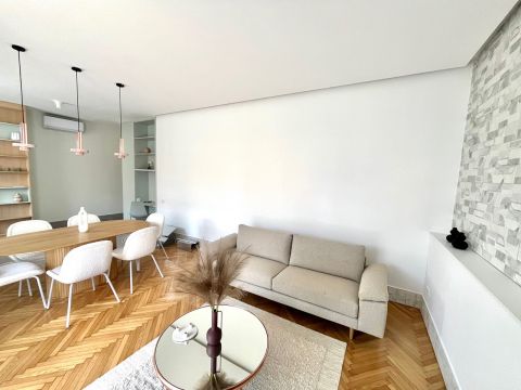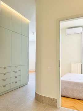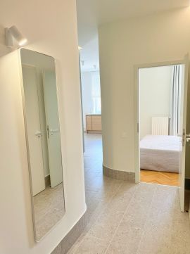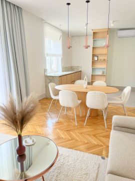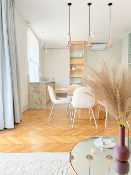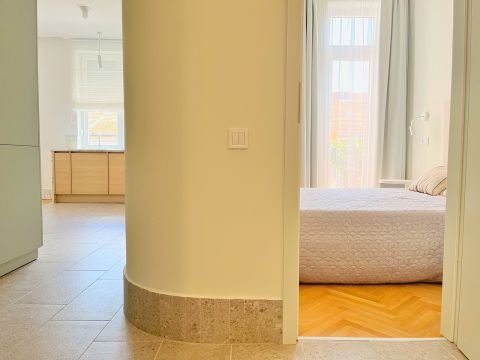 A lakás belsőépítész tervei alapján került felújításra és átalakításra. A nappali és a konyha-étkező egy tágas légtérben található, dupla erkélyajtóval a teraszra. A hálószobából szintén van kijárat a teraszra. Külön vendég WC helyiség került kialakításra.