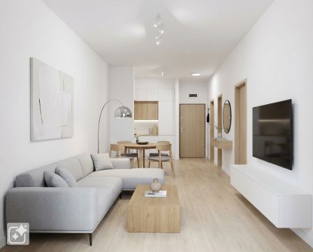 Az ingatlant egy utcai nézetű szoba, egy háló helység, egy tágas amerikai konyhás nappali+ étkező, egy szintén tágas fürdőszoba és egy külön WC alkotják.