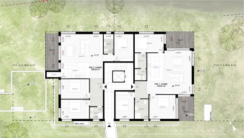 Fsz.1 : 104 nm nettó, Nappali+ 3 szoba+ 20 nm terasz +kizárólagos használatú kert  (2 db. kocsibeálló+3,5 nm tároló)
