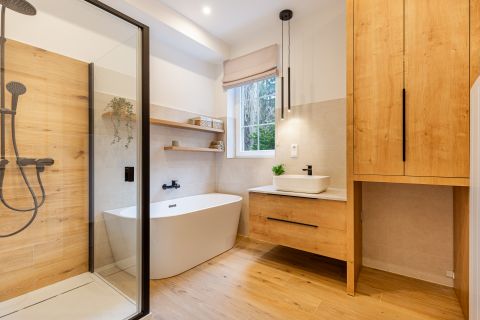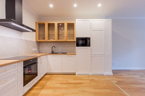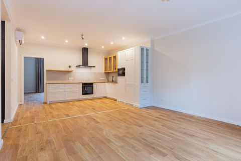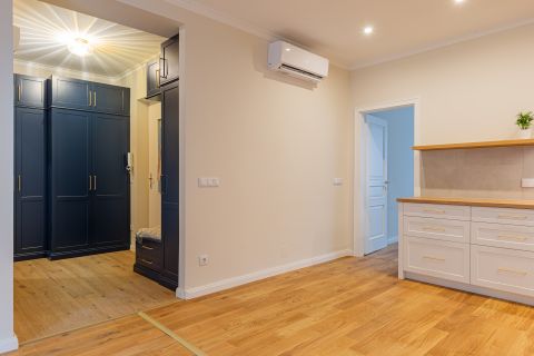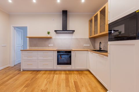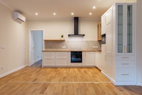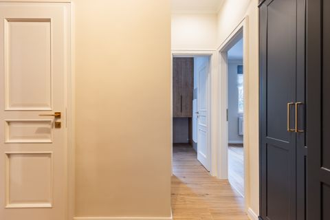 A felújítás során a nagypolgári elegancia magas belmagasság, arányos terek megmaradt, miközben modern, letisztult megoldások tették igazán komfortossá az otthont.
