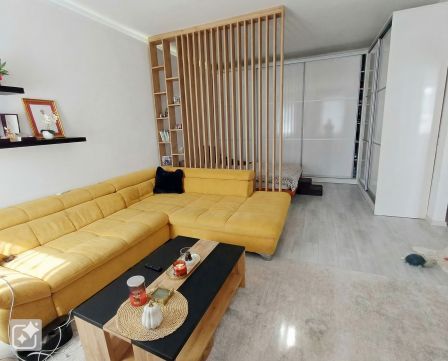 A lakás elosztása praktikus: egy tágas szoba, egy külön konyha, fürdőszoba és előszoba alkotják. A szoba világos és jól berendezhető.