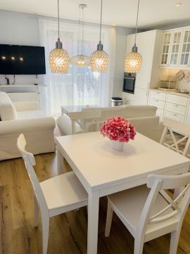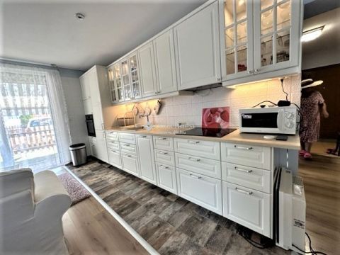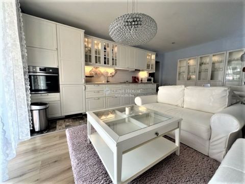 Világos, bútorozott, háztartási gépekkel felszerelt (mosó-szárító gép, beépített sütő, beépített hűtő-fagyasztó gép, beépített elektromos főzőlap, szag elszívó, mosogatógép, mikróhullámú sütő).