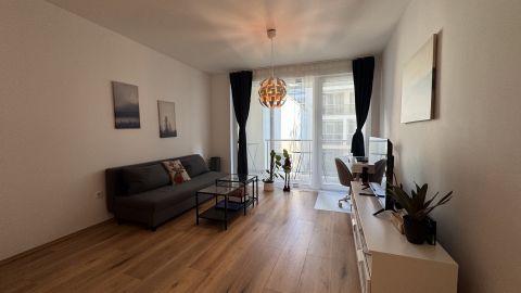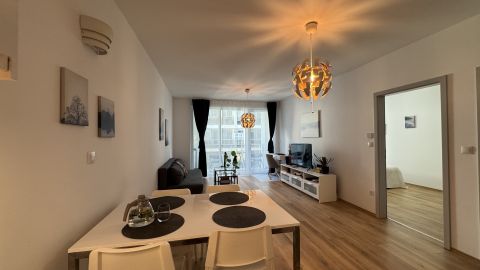 A lakás elrendezése kényelmes és praktikus, világos nappalival és jól szeparált hálószobával.