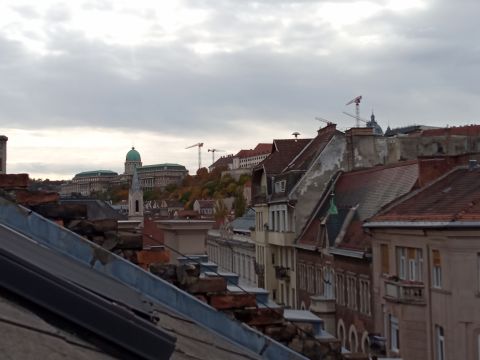 A szoba felőli kilátás a Budai várra, a lakás másik oldalán az erkély pedig rendezett belső-udvarra néz.