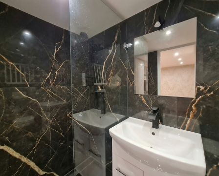 A fürdőszobában pedig épített zuhany, geberites wc, villanybojler, elektromos törölközőszárító, mosdó szekrény, tükrös üvegpolc kerül.
