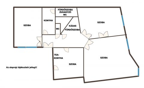 A lakás elrendezése rendkívül praktikus: négy tágas szoba, két fürdőszoba (egy zuhanyzós és egy kádas), külön mellékhelyiség, egy teljesen felszerelt konyha, valamint egy külön teakonyha, továbbá kényelmes közlekedő helyiség áll rendelkezésre. Az ingatlanhoz egy kb. 10 m²-es, zárható, kizárólagos használatú pince is tartozik.