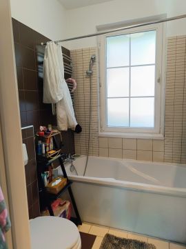 A fürdőszoba kádas kialakítású, minőségi burkolatokkal.