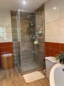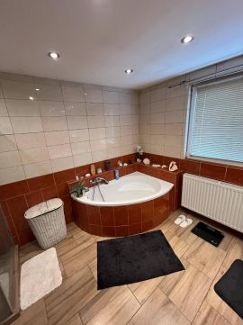 nagy méretű, ablakos fürdőszoba (11 m2), sarokkáddal és zuhanyzóval,