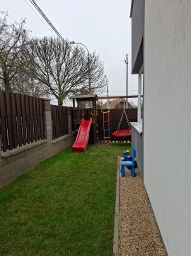 A kerben 50 m2 : modern, fából készült játszótér (mászóka, csúszda, hinta), kerti tároló a szerszámoknak, kényelmes teraszrész a grillezéshez, pihenéshez
