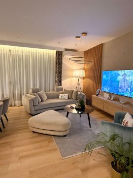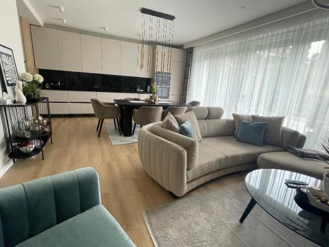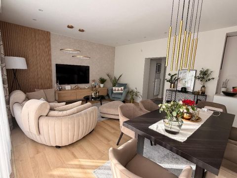 A nappali, terasz, udvar kapcsolata különösen élhetővé teszi a lakást, ideális családi és baráti összejövetelekhez.