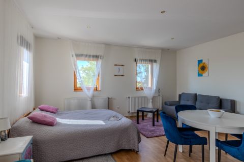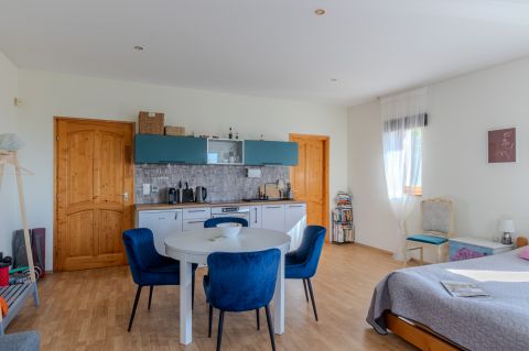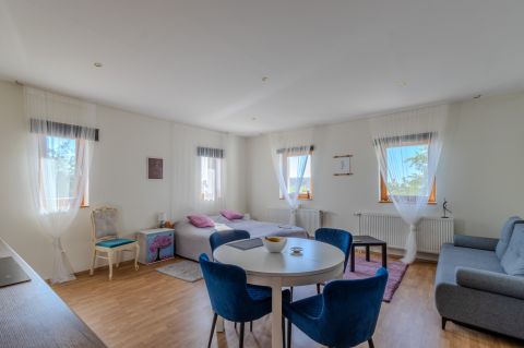 Ez a tarcali borház egy közel 300 nm-es lankás telken helyezkedik el, háromszintes, és két különálló, teljesen berendezett apartmant kínál. A felső szinten két fő kényelmes elhelyezésére van lehetőség, míg az alsó szinten akár négy fő is otthonosan elfér. Mindkét apartmanhoz fürdőszoba, valamint külön bejárat tartozik, a két szint külön lépcsőházon keresztül közelíthető meg. Az ingatlanban összesen három fürdőszoba és WC található.