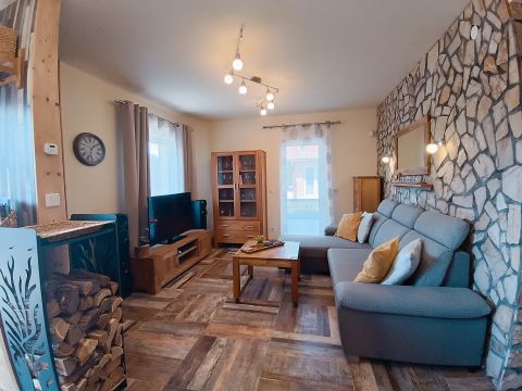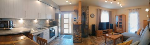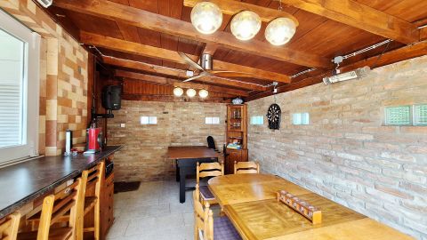 IV. wellness: party helyiség (épített kemencével biliárddal, csocsó asztallal, darts, pingpongasztal), jakuzzi rész, vendég WC, szauna