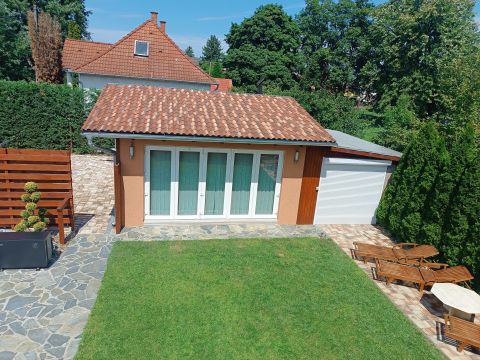 I. LAKÓHÁZ: kertkapcsolatos nappali/étkező, konyha, kamra, 2 külön nyíló szoba, mini wellness rész, fürdőszoba/WC