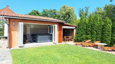 A kiváló állapotban lévő, 3 lakrészből álló mediterrán hangulatú épületegyüttes 648 nm szépen gondozott telken helyezkedik el, modern technikai kivitelezésben, okos otthon funkcióval épült. 8 szobával, valamint 3 fürdőszobával, 3 gépesített konyhával, kültéri medencével, nagy teraszokkal, wellness részleggel várja új tulajdonosát. Az ingatlan ideális választás lehet családok számára, akik a kényelmes és tágas életteret keresik. Befektetési célra is kitűnő lehetőséget kínál, hiszen a Balaton közelsége és a környék turisztikai vonzereje garantálja a jövedelmezőséget. A Nyugati-övcsatornára való panorámás kilátás biztosítja, hogy a természet szépségét mindennap élvezheti illetve közvetlen vizi úton is kijuthat a Balatonra.