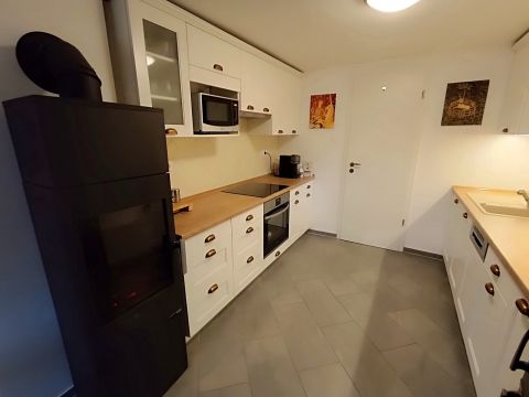 -Konyhában és étkezőben elektromos panel + modern fatüzelésű hőtárolós kályha