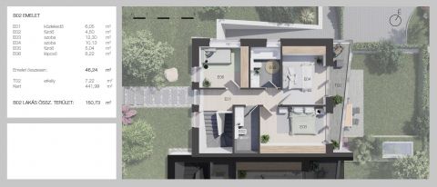 Hasznos alapterület: 150 m2, teraszok: 34,44 m2, kert mérete: 452 m2, hálószobák: 3, garázs 2