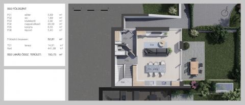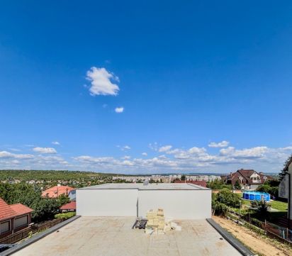 Hasznos alapterület: 150 m2, teraszok:34,44 m2, kert: 414 m2, hálószobák: 3, garázs: 2