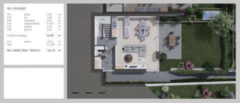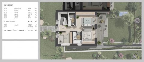 Hasznos alapterület: 150 m2, teraszok: 34,44 m2, kert mérete: 452 m2, hálószobák: 4, garázs 1