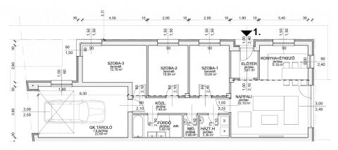 A ház egy szintes, 84 nm-es, nappali + 3 szobával rendelkezik, + 20 nm-es garázs, + terasz.