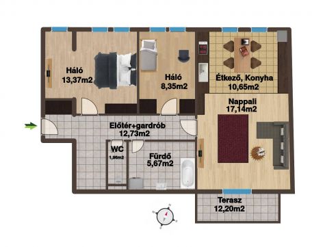 A lakás kialakítása modern és letisztult, magas műszaki tartalommal: