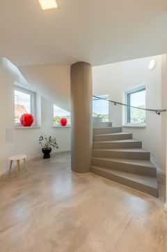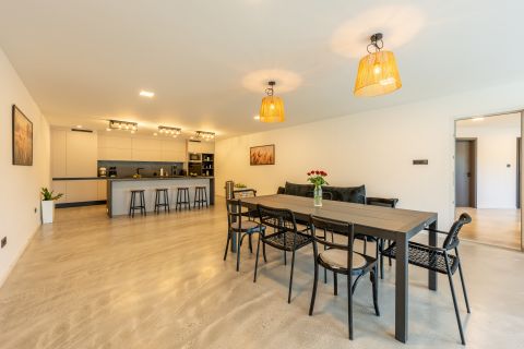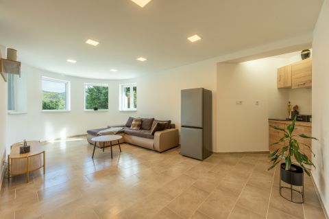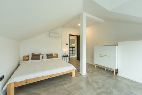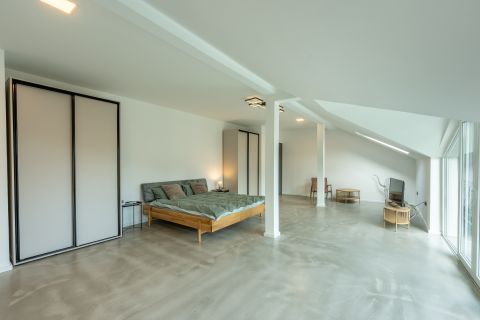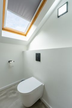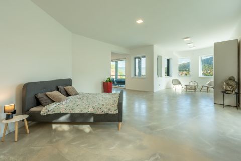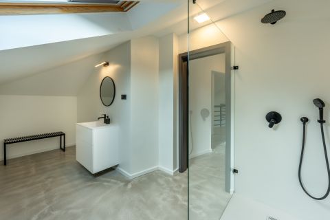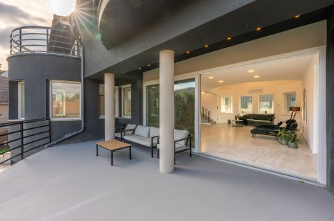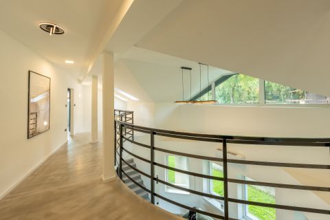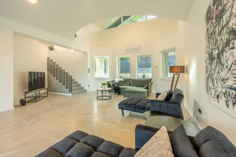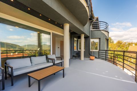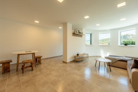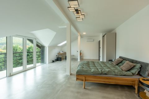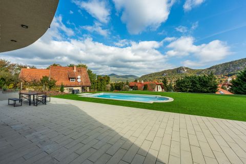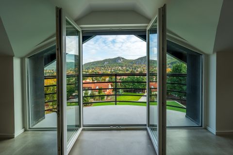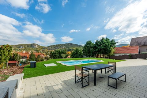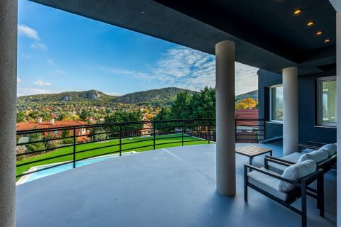 A ház minden helyisége bőséges természetes fényben fürdik, a nagy üvegfelületeknek köszönhetően pedig a környező hegyek és a zöldellő kert látványa szinte minden ablakból élvezhető. Az épület kialakítása a harmóniát és nyugalmat szolgálja, miközben minden modern kényelmet kínál a mindennapokhoz. Ez az otthon ideális választás mindazok számára, akik tágas, napfényes, természetközeli életteret keresnek a Pilis lábánál.