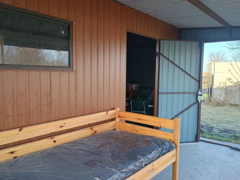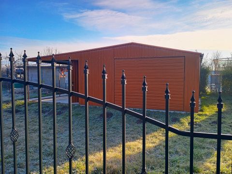 A telken egy beton alapra épített, 40 mm-es fém szerkezetű garázs kapott helyet, terasszal, amely többféle célra is kiválóan használható. Az épület villannyal ellátott, valamint a víz bevezetése elő van készítve.