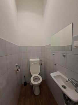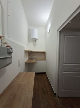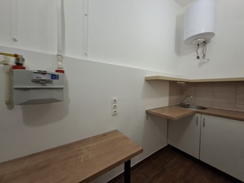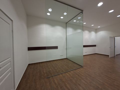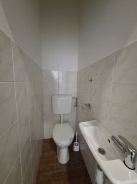 bejárattal, 2 nagy ügyféltérrel, konyhával, tárolóval és 2 db mosdós wc-vel.