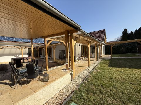 - Fűtés, melegvíz(vendégházban): napelem rendszer (18 kW), 3 fázisú Solar Edge inverterrel, Vaillant (levegő-víz ) hőszivattyús rendszerrel (16 kW), padlófűtéssel/radiátorokkal