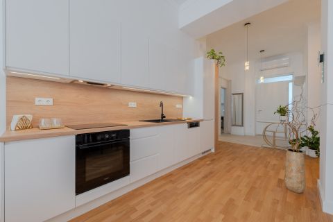 Amerikai Konyhás Nappali: A lakás szíve a tágas közösségi tér, ahol a beépített, gépesített konyhabútor és a stílusos konyhasziget a funkcionalitást és a designt ötvözi.