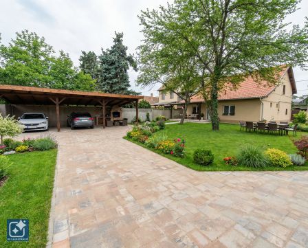 A nagykaputól a kocsibeállóhoz térkövezett út vezet a házhoz térkövezett járda.