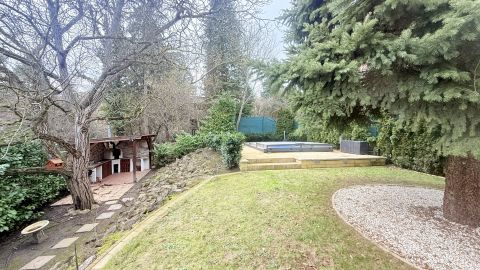 A kert praktikus méretű, gondos kezek tervezték meg minden szegletét. A hátsó kertben helyeztek el egy kültéri, fedett konyhát, kemencével, egy sós vizes, ellenáramoltatóval ellátott medencét. A ház előtt autóbeállót találunk, fedett tárolót, kis játszósarkot.