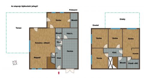 A hőszivattyús padlófűtésű ingatlan alsó szintjén amerikai konyhás nappali teraszkapcsolattal, két mosdó + WC, egy hálószoba, előtér, két háztartási helyiség, és egy garázs került kialakításra, amin keresztül a lakott rész közvetlenül megközelíthető.