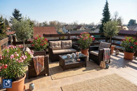 Az emeleten két szoba és egy fürdőszoba található, továbbá egy közel 20 m²-es keleti fekvésű napozóterasz, illetve egy nyugati erkély.