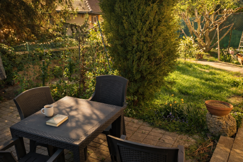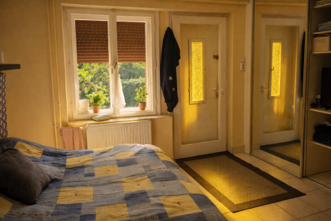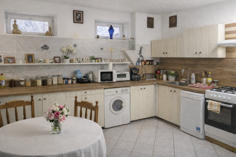 Az ingatlan elosztása rendkívül funkcionális: a két különnyíló hálószoba és a napfényes nappali mellett egy konyha, egy fürdőszoba és egy praktikus kamra biztosítja a kényelmet. A lakás igazi különlegessége a határok elmosódása kint és bent között: több helyiségből is közvetlen kijárás nyílik a kertbe, így a természet szinte beáramlik a belső terekbe.