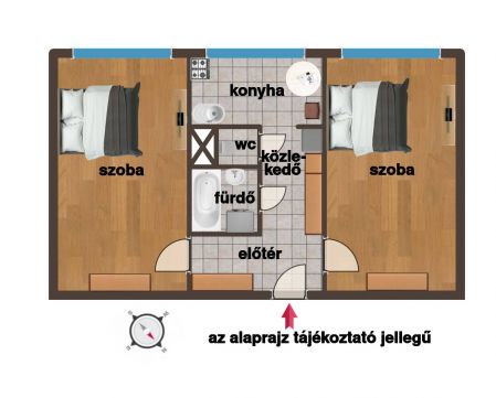 A lakás egyik legnagyobb előnye a kiváló elosztás: a két, egymástól függetlenül megközelíthető, azonos méretű szoba ideális választássá teszi lakótársak számára, bérbeadás céljára, illetve első saját otthonnak is kényelmes és jól élhető megoldást kínál.