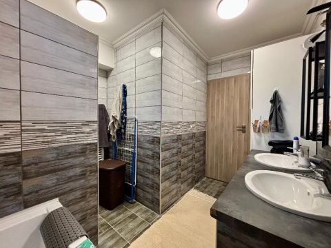 -fürdőszoba zuhanyzóval, fürdőkáddal és dupla mosdókagylóval