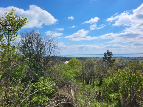 A telken jelenleg egy felújítandó állapotú borospince valamint egy romos présház helyezkedik el, villany közvetlenül a telek előtt található, vízbekötés, vízórával telken belül. Az enyhén lejtős, fás-cserjés telek két párhuzamos utcáról is könnyen megközelíthető. A telekről gyönyörű balatoni panoráma tárul elénk.