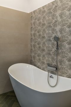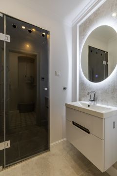 Két különböző karakterű fürdő szolgálja a mindennapokat. Kádas és zuhanyzós kialakítás, plusz külön WC – ez az a kombináció, ami több emberrel, vendégekkel, vagy intenzívebb városi élet mellett is kényelmesen működik. A képeken látható anyaghasználat és világítás visszafogottan elegáns összhatást ad. Kiforrott műszaki rendszer adja a komfort alapját. Többféle hőleadás biztosít egyenletes hőérzetet, a légcsatornás klimatizálás pedig diszkréten, „láthatatlanul” dolgozik. Külön gépészeti tér választja le a technikát a lakófunkciókról, ami ritka, és nagyon szerethető megoldás.