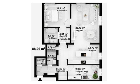 Belépéskor egy jól szervezett közlekedőtér fogad, amely végigvezeti az érkezőt a lakáson. Innen minden helyiség külön nyílik, így a funkciók tisztán elkülönülnek, mégis egy összefüggő rendszerben maradnak. Ez az elrendezés átlátható, nyugodt működést ad, és nem kényszerít kompromisszumokra a mindennapokban. Középpontban a nappali és a konyha kapcsolata áll. Önálló karakterű konyhatér kapcsolódik az étkezőhöz és a nappalihoz, természetes átmenetekkel, jól értelmezhető határokkal. Vendégfogadásnál is komfortos, hétköznap pedig praktikus – a tér egyszerre tud társasági és működőképes lenni. Világos, kiegyensúlyozott arányok jellemzik a nappalit. Pihenésre és jelenlétre egyaránt alkalmas, nem igényel magyarázatot.
