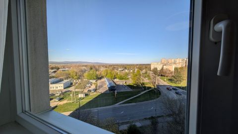 Kilátás a "végtelenbe és tovább": a lakás az épülettömb szélén helyezkedik el, így már nem a szomszéd házak szürke falait látni a nappaliból, hanem a Bakony lenyűgoző domborulatait!