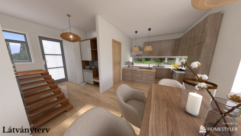 -Földszint: Előszoba, fürdő-WC, háztartási helyiség/kamra és egy nagyméretű amerikai konyhás nappali. A nappalihoz egy 28 m²-es terasz kapcsolódik, amely ideális helyszín családi pihenéshez.