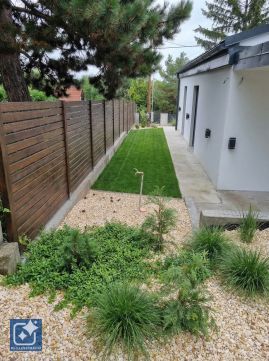 - az utcafronti kerítés tégla építésű, az épülettel megegyező színezéssel és WPC kerítéslécekkel